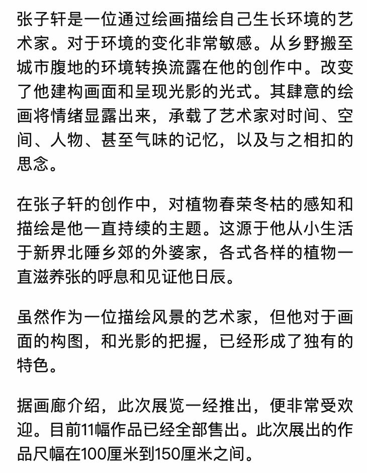 張子軒是一位通過繪畫描繪自己生長環境的藝術家。對於環境的變化非常敏感。從鄉野搬至城市腹地的環境轉換流露在他的創作中。改變了他建構畫面和呈現光影的光式。其肆意的繪畫將情緒顯露出來,承載了藝術家對時間、空間、人物、甚至氣味的記憶,以及與之相扣的思念。