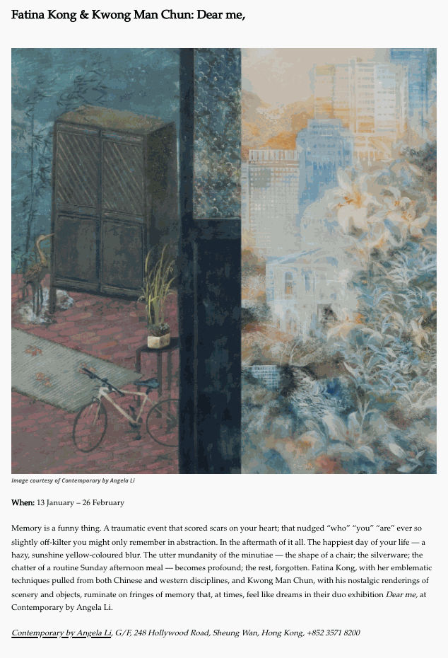Memory is a funny thing. A traumatic event that scored scars on your heart; that nudged “who” “you” “are” ever so slightly off-kilter you might only remember in abstraction. In the aftermath of it all. The happiest day of your life — a hazy, sunshine yellow-coloured blur. The utter mundanity of the minutiae — the shape of a chair; the silverware; the chatter of a routine Sunday afternoon meal — becomes profound; the rest, forgotten. Fatina Kong, with her emblematic techniques pulled from both Chinese and western disciplines, and Kwong Man Chun, with his nostalgic renderings of scenery and objects, ruminate on fringes of memory that, at times, feel like dreams in their duo exhibition Dear me, at Contemporary by Angela Li.
