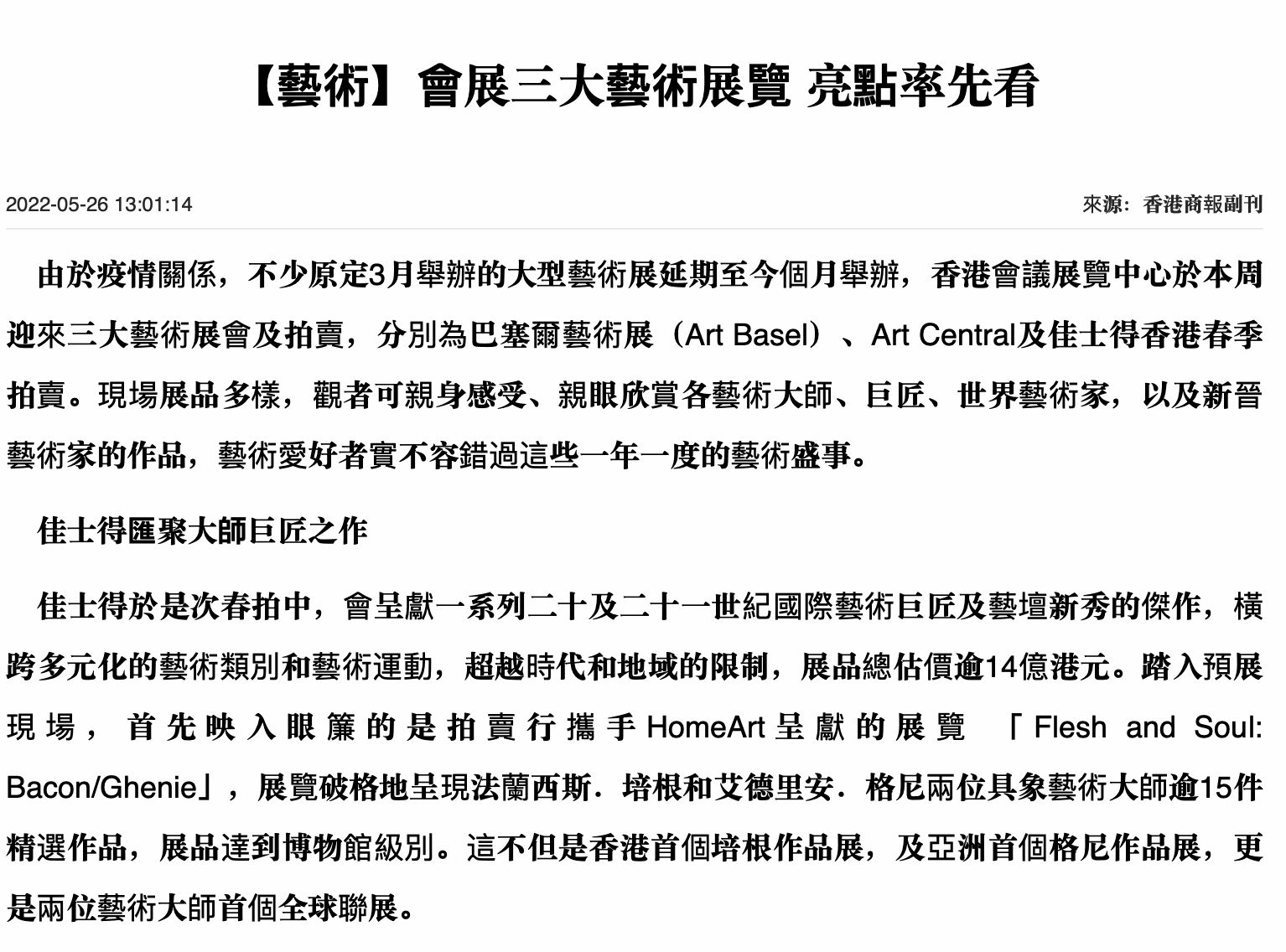 由於疫情關係,不少原定3月舉辦的大型藝術展延期至今個月舉辦,香港會議展覽中心於本周迎來三大藝術展會及拍賣,分別為巴塞爾藝術展(Art Basel)、Art Central及佳士得香港春季拍賣。現場展品多樣,觀者可親身感受、親眼欣賞各藝術大師、巨匠、世界藝術家,以及新晉藝術家的作品,藝術愛好者實不容錯過這些一年一度的藝術盛事。